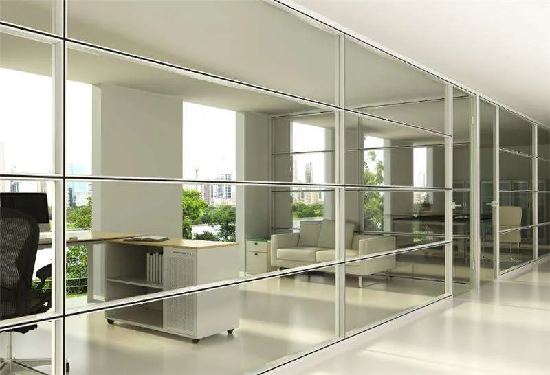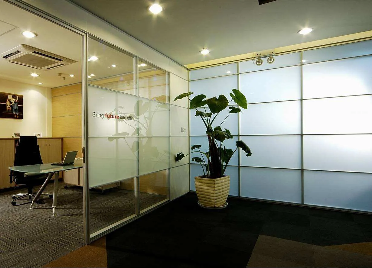 玻璃隔断是办公室墙面装修中新型的装修方式。隔断、屏风甚至整面墙,都可以用玻璃制成。在办公室装修效果图中使用了玻璃隔断,不但增加了办公室的视觉面积,在你更换更大的办公室的时候还能做到重复利用,是现代公室装修的明智选择。玻璃出色的透光性 和透明感,给人明亮温和的感受,它不会增加压抑感,加之防水防潮等性能,是极佳的隔墙材料。