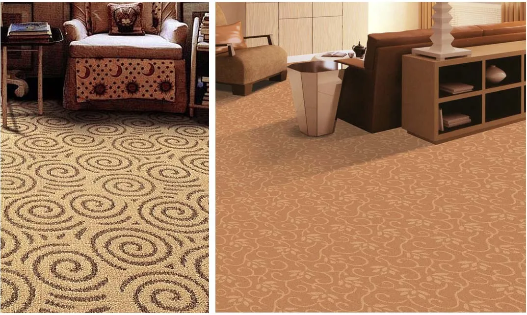 2) 机织纯毛的地毯 。机织纯毛地毯由于采用了机器化生产,提高了工效,节省了人力,故价格低于手工编织地毯,但其性能与手工编织纯毛地毯相似,是介于手工编织纯毛地毯与化纤地毯之间的一种中高档地毯,使用于接待中心装修、会议室装修、宴会厅装修、住宅装修等使用。