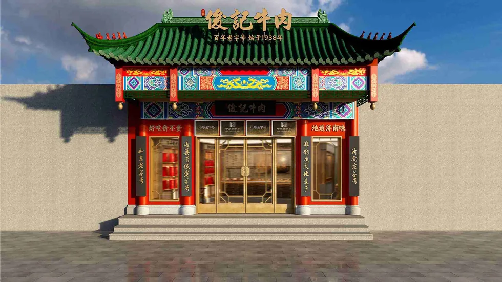 济南铭仕家园装饰为百年老字号「俊记牛肉」打造全新门店形象,以中式古建风格还原品牌百年底蕴。门头复刻传统宫殿形制,朱红立柱搭配青绿飞檐,搭配非遗文化墙与老物件展示区,传递地道济南风味。
