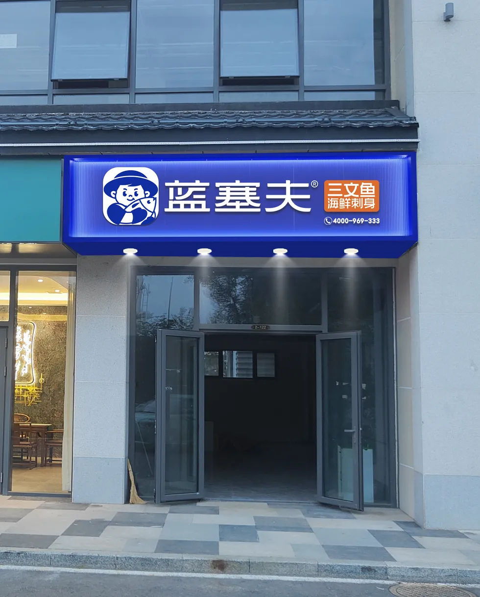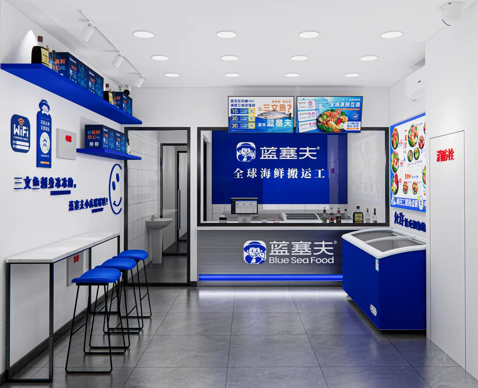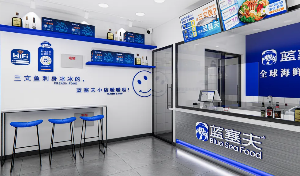 蓝白撞色的门头一眼吸睛,明亮的灯光下,「全球海鲜搬运工」的标语格外醒目。走进店内,干净利落的空间里,蓝调货架与简约吧台相映成趣,墙上 “三文鱼刺身冰冰的,蓝塞夫小店暖暖哒” 的标语,瞬间拉满温馨感。